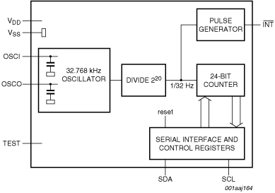 The main function of the oscillator is to generate a 1⁄32 Hz clock signal which is used to increment a 24 bit binary counter. The counter can be read over the serial interface and can also be set to any desired value. Control over the divider chain also allows for accurate starting of the counter. Incrementing of the counter value during read is prevented by freezing of the counter during access.
