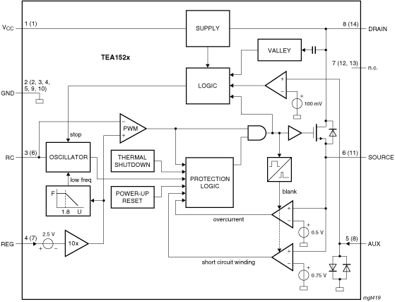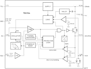The TEA152x family STARplug is a Switched Mode Power Supply (SMPS) controller IC that operates directly from the rectified universal mains. It is implemented in the high-voltage EZ-HV SOI process, combined with a low-voltage Bipolar Complementary Metal-Oxide Semiconductor (BiCMOS) process. The device includes a high-voltage power switch and a circuit for start-up directly from the rectified mains voltage. A dedicated circuit for valley switching is built in, which makes a very efficient slim-line electronic power-plug concept possible. In its most basic version of application, the TEA152x family acts as a voltage source. Here, no additional secondary electronics are required. A combined voltage and current source can be realized with minimum costs for external components