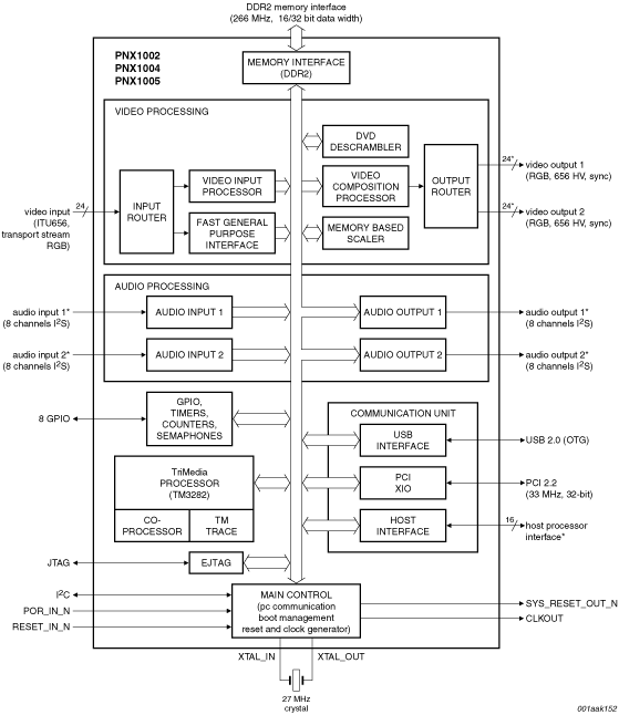 Based on the TriMedia DSP technology, the PNX1005 supports programmable signal processing for high-definition video compression, decompression, analysis and improvement. It supports multiple video compression standards, such as H.264, MPEG®-4, MJPEG and many others. The PNX1005 handles full 1080p/60 on input and output for HD 1080p picture processing. The PNX1004 is a cost-optimized version in a smaller package. The PNX1002 is an audio digital signal processor (DSP) for audio processing in both fixed and floating point, focused on audio acoustic processing. Also available are development boards for PNX1005: OM4965 is a PCI development board with HDMI input and output and 4 channel video input. OM4966 is a complete reference design for 16 channel DVR solution. OM4967 is a standalone development board with HDMI input and output, 8 channel video input, SATA, Ethernet and other interfaces. A complete Software Development Kit is available from NXP®. To receive the software, please register on www.tcshelp.com