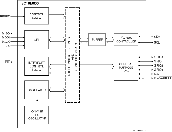 The SC18IS600 is designed to serve as an interface between the standard SPI of a host (microcontroller, microprocessor, chip set, etc.) and the serial I²C-bus. This allows the host to communicate directly with other I²C-bus devices. The SC18IS600 can operate as an I²C-bus controller-transmitter or controller-receiver. The SC18IS600 controls all the I²C-bus specific sequences, protocol, arbitration and timing.