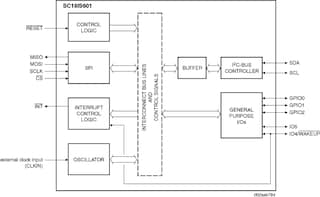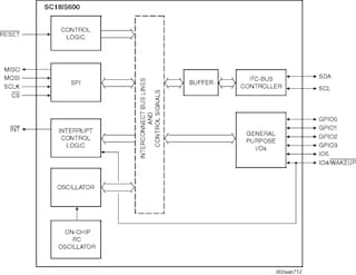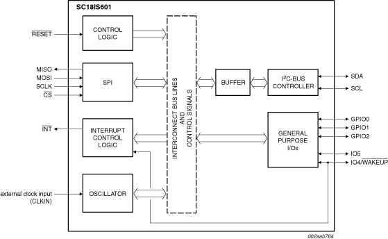 The SC18IS600 is designed to serve as an interface between the standard SPI of a host (microcontroller, microprocessor, chip set, etc.) and the serial I²C-bus. This allows the host to communicate directly with other I²C-bus devices. The SC18IS600 can operate as an I²C-bus controller-transmitter or controller-receiver. The SC18IS600 controls all the I²C-bus specific sequences, protocol, arbitration and timing.