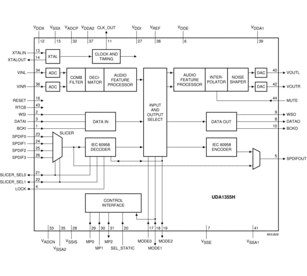 The UDA1355H is a single-chip IEC 60958 decoder and encoder with integrated stereo digital-to-analog converters and analog-to-digital converters employing bitstream conversion techniques.