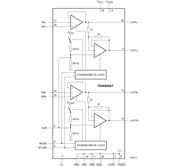 The TDA8542AT is a two channel audio power amplifier for an output power of 2 × 1.5 W with an 8 Ω load at a 6 V supply. The circuit contains two Bridge-Tied Load (BTL) amplifiers with a complementary PNP-NPN output stage and standby/mute logic. The TDA8542AT comes in a 20-pin SO package.