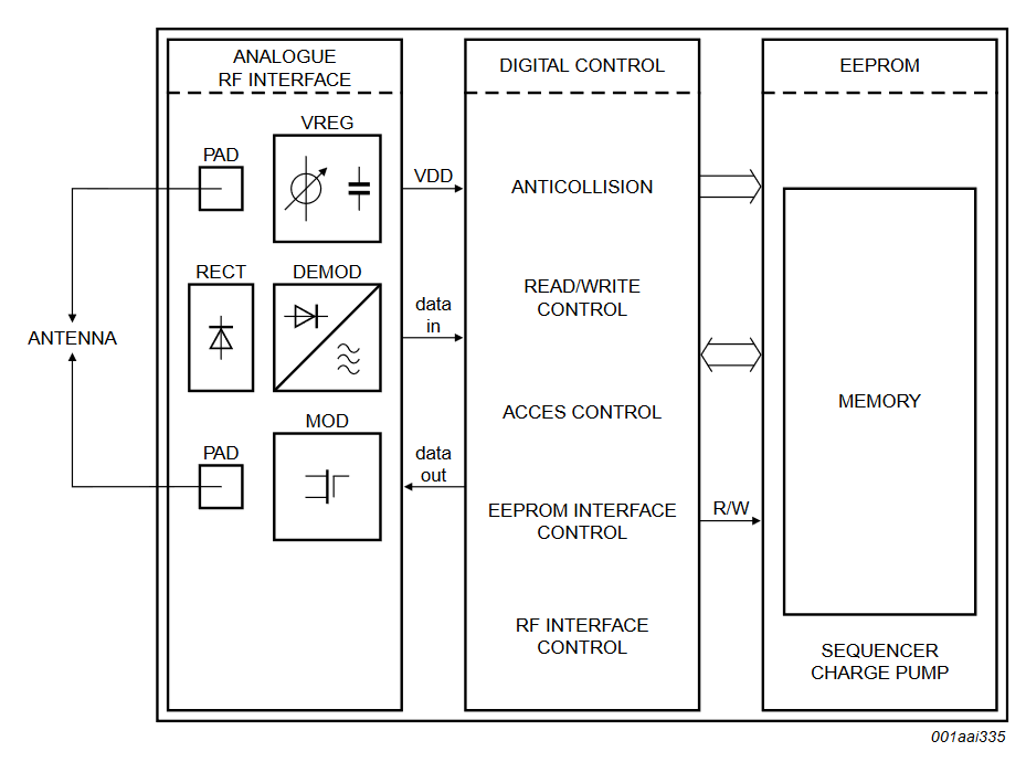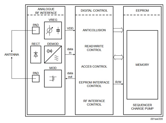 The tag requires no internal power supply. Its contactless interface generates the power supply via the antenna circuit by propagative energy transmission from the interrogator (read/write device), while the system clock is generated by an on-board oscillator. The contactless interface demodulates data transmitted from the interrogator to the UCODE HSL based tag, and further modulates the electromagnetic field provided by the interrogator for data transmission from the UCODE HSL based tag to the interrogator.