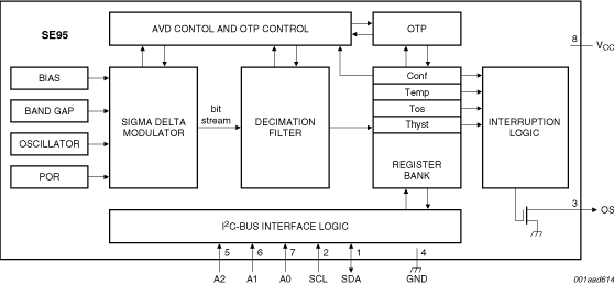 The SE95 is a temperature-to-digital converter using an on-chip band gap temperature sensor and Sigma Delta analog-to-digital conversion technique. The device is also a thermal detector providing an overtemperature detection output.