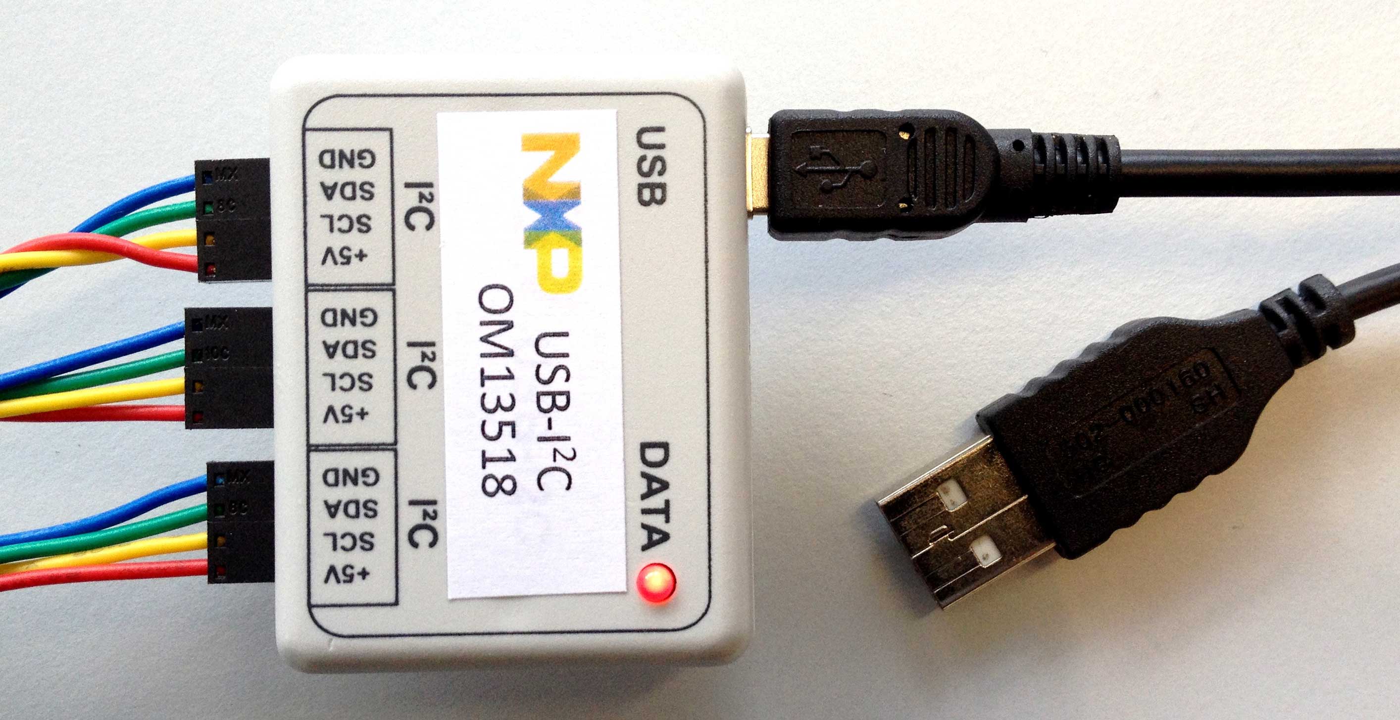 The OM13518 dongle is an easy to use interface handler between the USB of a PC and the I²C-bus. The OM13518 dongle is a ready to run module. It creates a virtual COM-port via a USB connection. It provides three I²C-bus connections with 5 V option to power the application (max 450 mA).