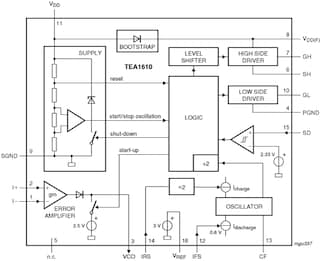 The TEA1610 is a monolithic integrated circuit implemented in a high-voltage Diffusion Metal Oxide Semiconductor (DMOS) process. The circuit is a high voltage controller for a zero-voltage switching resonant converter. The IC provides the drive function for two discrete power MOSFETs in a half-bridge configuration. It also includes a level-shift circuit, an oscillator with accurately-programmable frequency range, a latched shut-down function and a transconductance error amplifier.