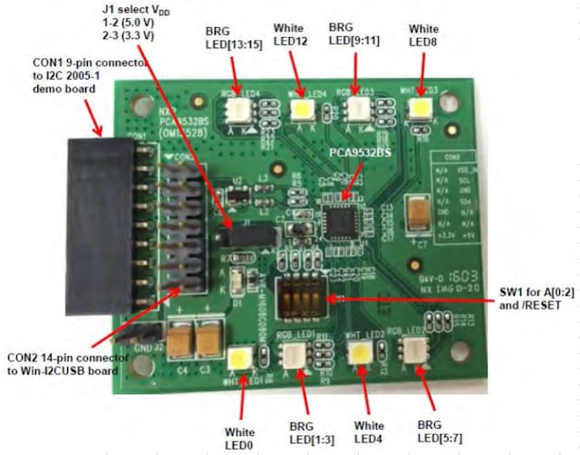 The PCA9532 evaluation board features LEDs for color mixing, blinking and dimming demonstrations. A graphical interface allows the user to easily explore the different functions of the driver. The board can be connected in series with other I²C demo-boards to create an evaluation system. The IC communicates to the host via the industry standard I²C-bus/SMBus port. The evaluation software runs under Microsoft® Windows™ PC platform.