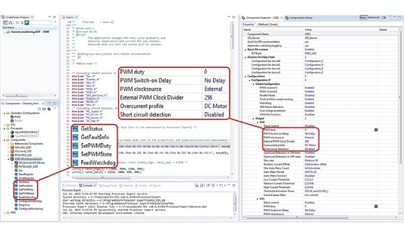 TPMC-PEXPERTは、MC33937三相プリドライバを対象としたProcessor Expertサポートおよびサンプル・プロジェクト(CodeWarrior 10.6以降、Kinetis Design Studio 2.0以降向け)で構成されています。また、Driver Suite 10.4以降のコンポーネントを使用することもできます。