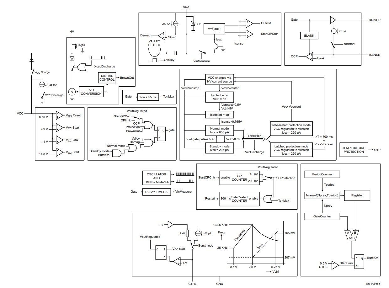 The TEA18363 is a controller IC for low-cost Switched Mode Power Supplies (SMPS). It is intended for flyback topologies. The built-in green functions provide high efficiency at all power levels.