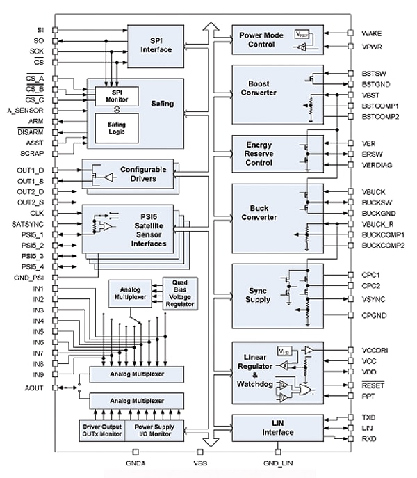 NXP®のMC33789は、エアバッグ・セーフティ・アプリケーション向けのミックスド・シグナルICで、各種の車両で使用されるさまざまなエアバッグ区分にわたって費用対効果に優れた柔軟なシステムICソリューションを提供します。