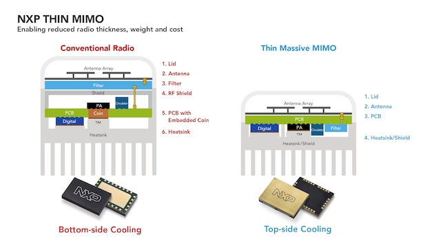 NXPのRF上面冷却テクノロジは、より薄型で軽量の5G Massive MIMO無線を実現します。また、専用のRFシールドが不要になり、RF設計と温度管理が分離されます。NXP初の上面冷却デバイス・ファミリは、3.3 GHz~3.8 GHzをカバーする64T64R (320 W) または32T32R (200 W) mMIMO無線用に設計されています。これらのモジュールは、NXP独自のLDMOSおよびGaN半導体テクノロジを組み合わせて、利得と効率の高いワイドバンド性能を実現し、400 MHzの瞬時帯域幅で31 dBの利得と46%の効率を提供します。
