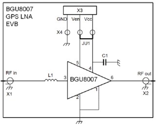 The BGU8007 is a Low Noise Amplifier (LNA) for GNSS receiver applications in a plastic leadless 6-pin, extremely small SOT886 package. The BGU8007 requires only one external matching inductor and one external decoupling capacitor. The BGU8007 adapts itself to the changing environment resulting from co-habitation of different radio systems in modern cellular handsets. It has been designed for low power consumption and optimal performance when jamming signals from co-existing cellular transmitters are present. At low jamming power levels it delivers 19 dB gain at a noise figure of 0.75 dB. During high jamming power levels, resulting for example from a cellular transmit burst, it temporarily increases its bias current to improve sensitivity.