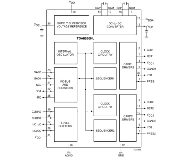 The TDA8020HL is a one-chip dual smart card interface. Controlled by the I²C-bus, it guarantees conformity to ISO 7816 or EMV2000 with very few external components.