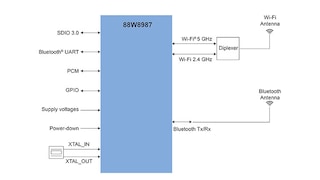 88W8987は、Wi-Fi (2.4/5 GHz) とBluetoothを統合した高集積のシングルチップ・ソリューションで、VHT (Very High Throughput) 製品の速度、信頼性、品質要件に対応するよう特別に設計されています。このシステム・オン・チップ (SoC) は、IEEE 802.11ac (Wave 2)(1x1、データレート最大MCS9 (433 Mbit/s))とBluetooth 5.2(Low Energy (LE) を含む)の同時運用および独立運用に対応します。また、このSoCは、Bluetooth ClassicとBluetooth Low Energy (LE) Smart Readyの運用にも対応しています。
