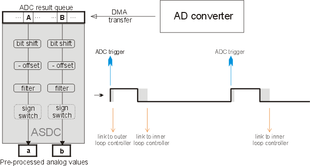 The ASDC function is useful for preprocessing analog values that are measured by an AD converter and transferred to the eTPU data memory by DMA transfer. The ASDC function is also useful for triggering the AD converter and synchronizing other eTPU functions.